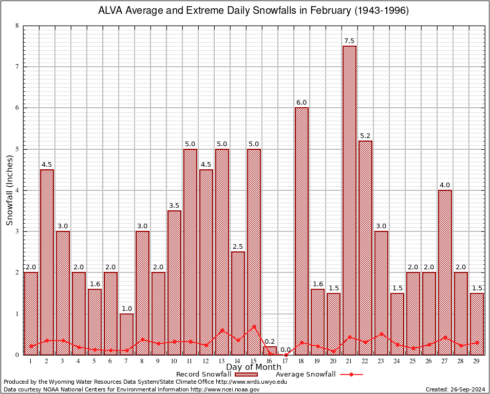 ALVA (480206) February Average and Extreme Daily Snowfall AMounts (1943-1996) To index page for ALVA