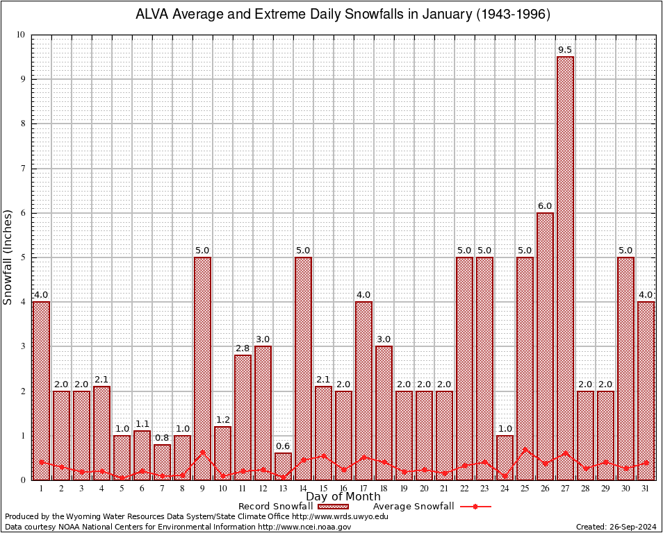 ALVA (480206) January Average and Extreme Daily Snowfall AMounts (1943-1996) To index page for ALVA