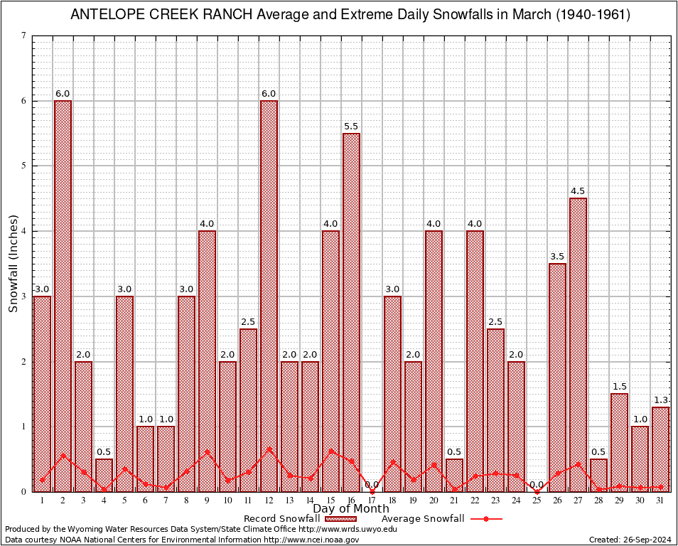 March Average and Extreme Daily Snowfall AMounts (1940-1961)