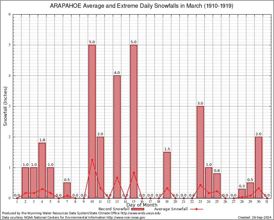 ARAPAHOE (480245) March Average and Extreme Daily Snowfall AMounts (1910-1919) To index page for ARAPAHOE