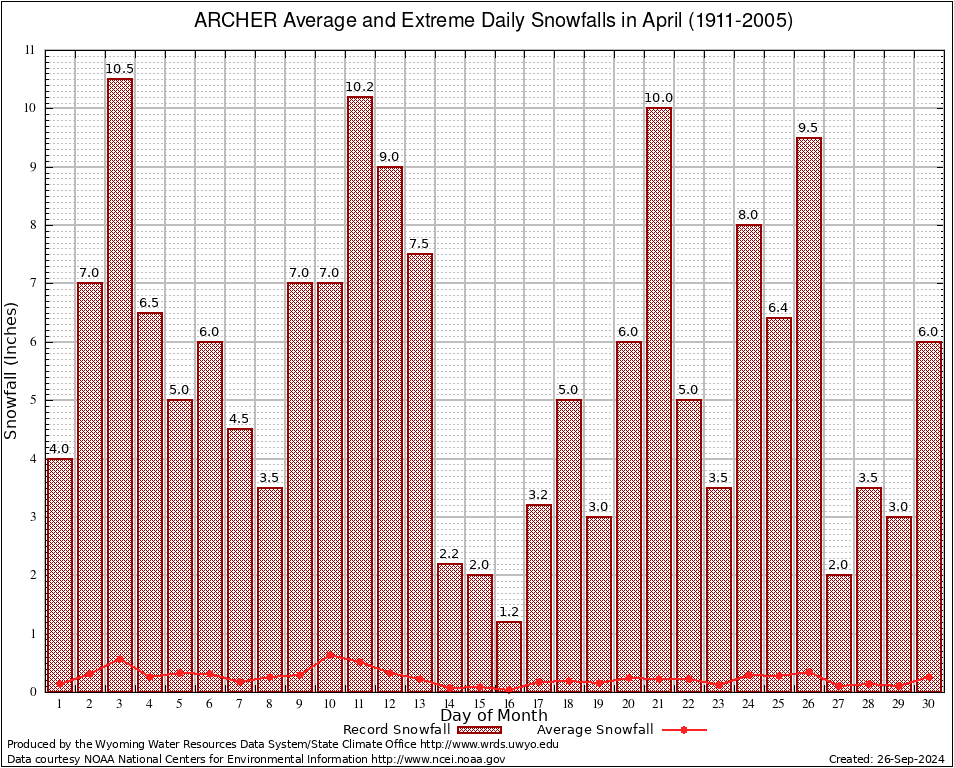 ARCHER (480270) April Average and Extreme Daily Snowfall AMounts (1911-2005) To index page for ARCHER