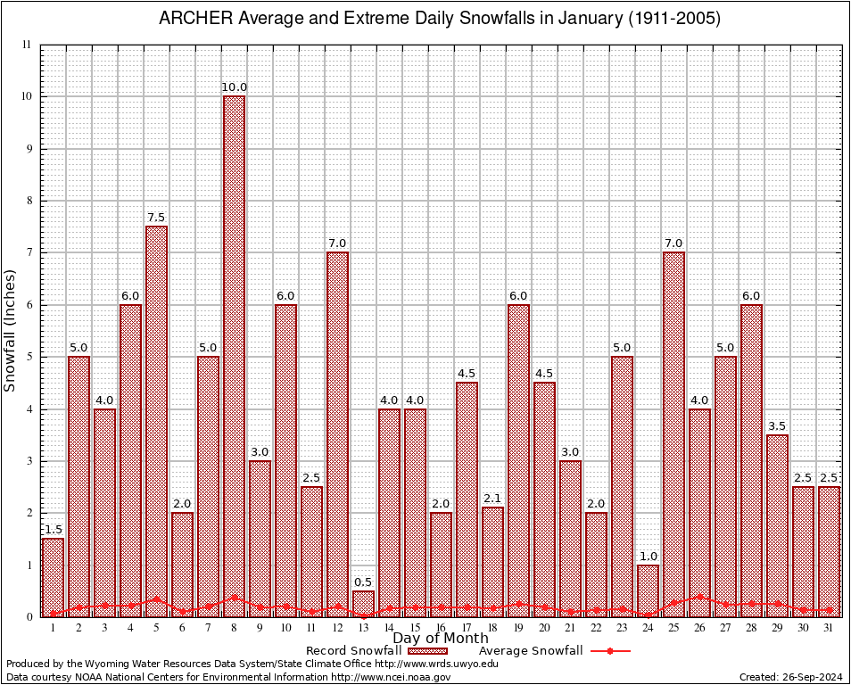 ARCHER (480270) January Average and Extreme Daily Snowfall AMounts (1911-2005) To index page for ARCHER