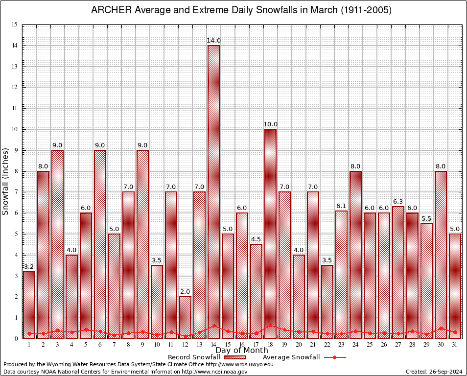 ARCHER (480270) March Average and Extreme Daily Snowfall AMounts (1911-2005) To index page for ARCHER