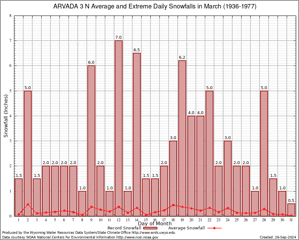 March Average and Extreme Daily Snowfall AMounts (1936-1977)