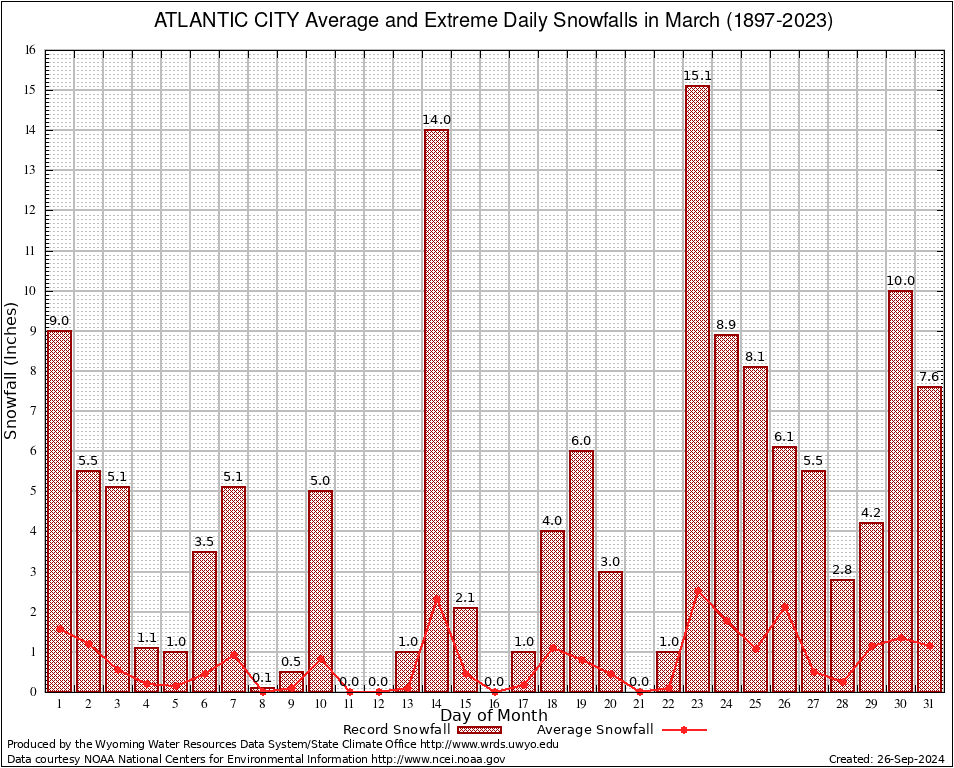 March Average and Extreme Daily Snowfall AMounts (1897-2023)