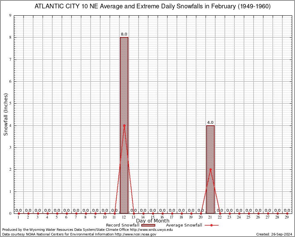February Average and Extreme Daily Snowfall AMounts (1949-1960)
