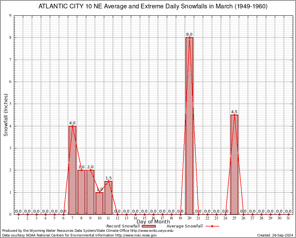March Average and Extreme Daily Snowfall AMounts (1949-1960)