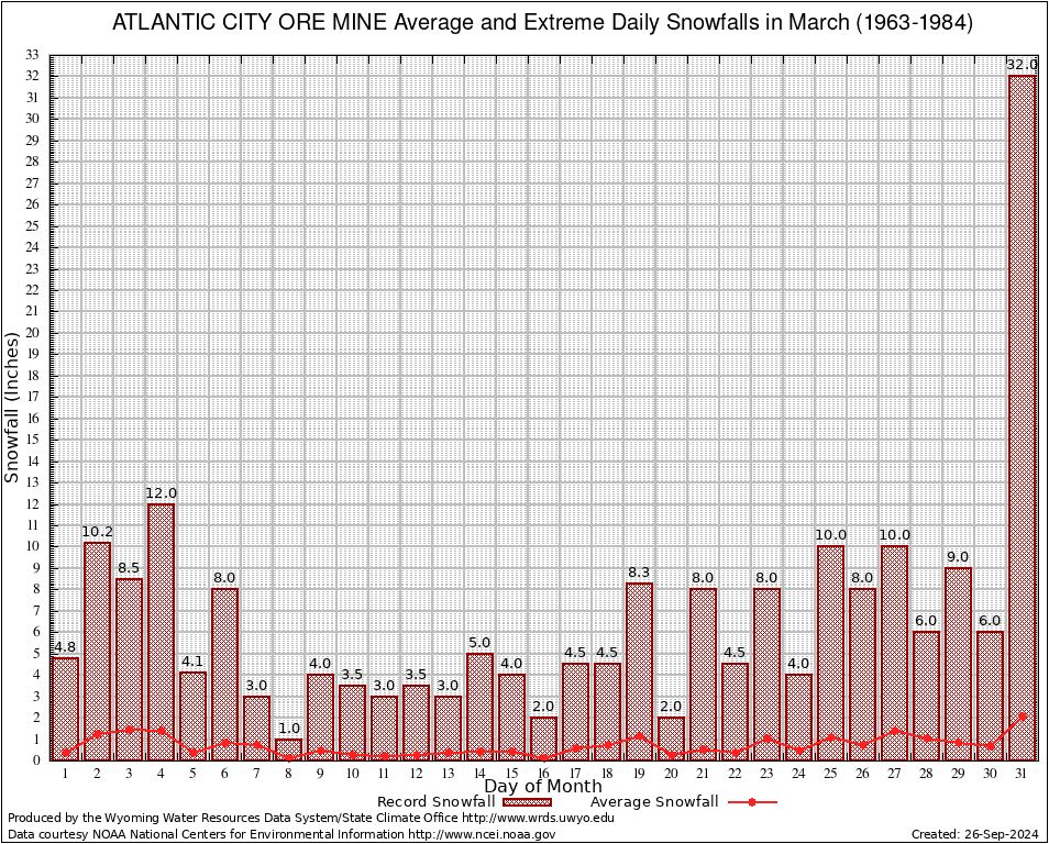 March Average and Extreme Daily Snowfall AMounts (1963-1984)