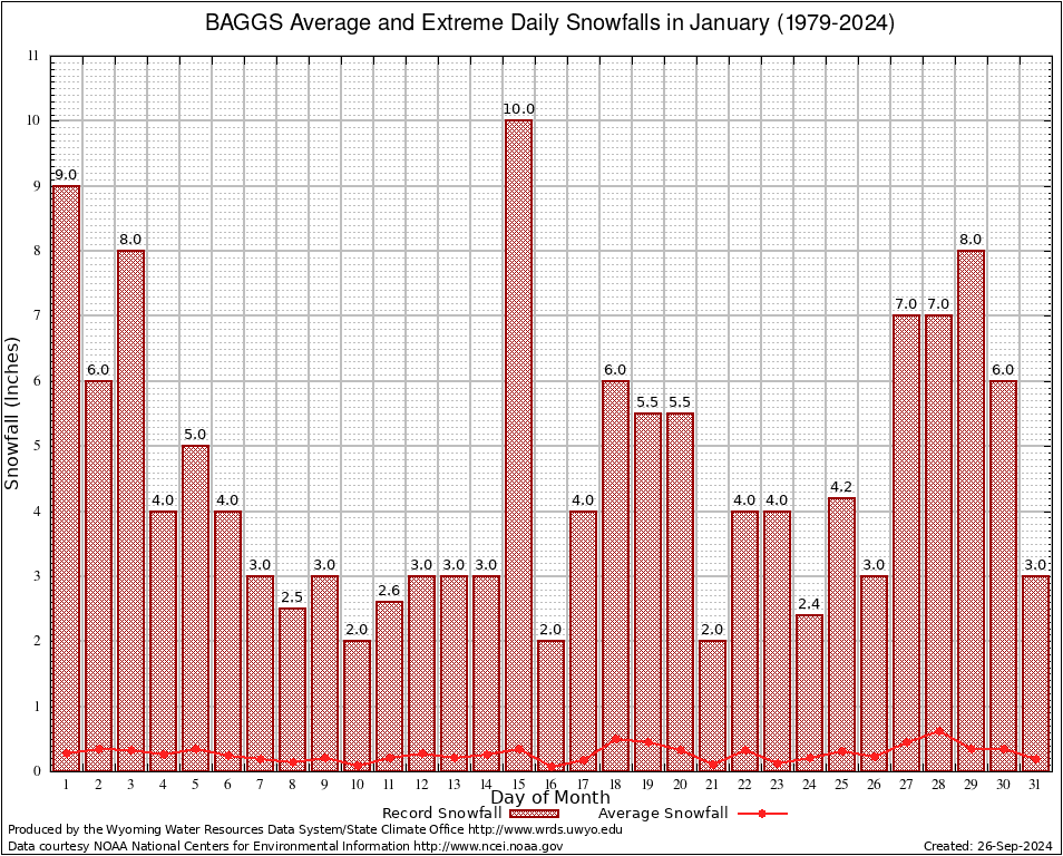 BAGGS (480484) January Average and Extreme Daily Snowfall AMounts (1979-2024) To index page for BAGGS