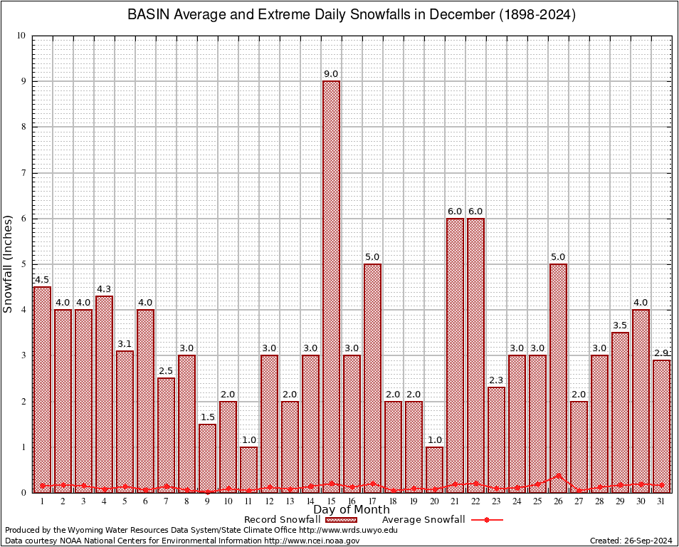 BASIN (480540) December Average and Extreme Daily Snowfall AMounts (1898-2024) To index page for BASIN