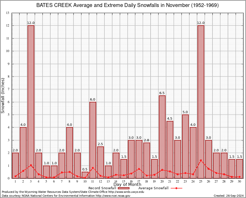 November Average and Extreme Daily Snowfall AMounts (1952-1969)