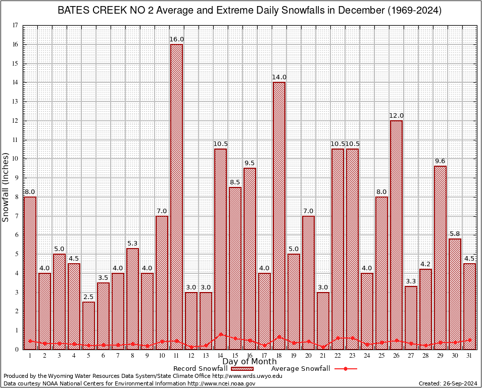 December Average and Extreme Daily Snowfall AMounts (1969-2024)