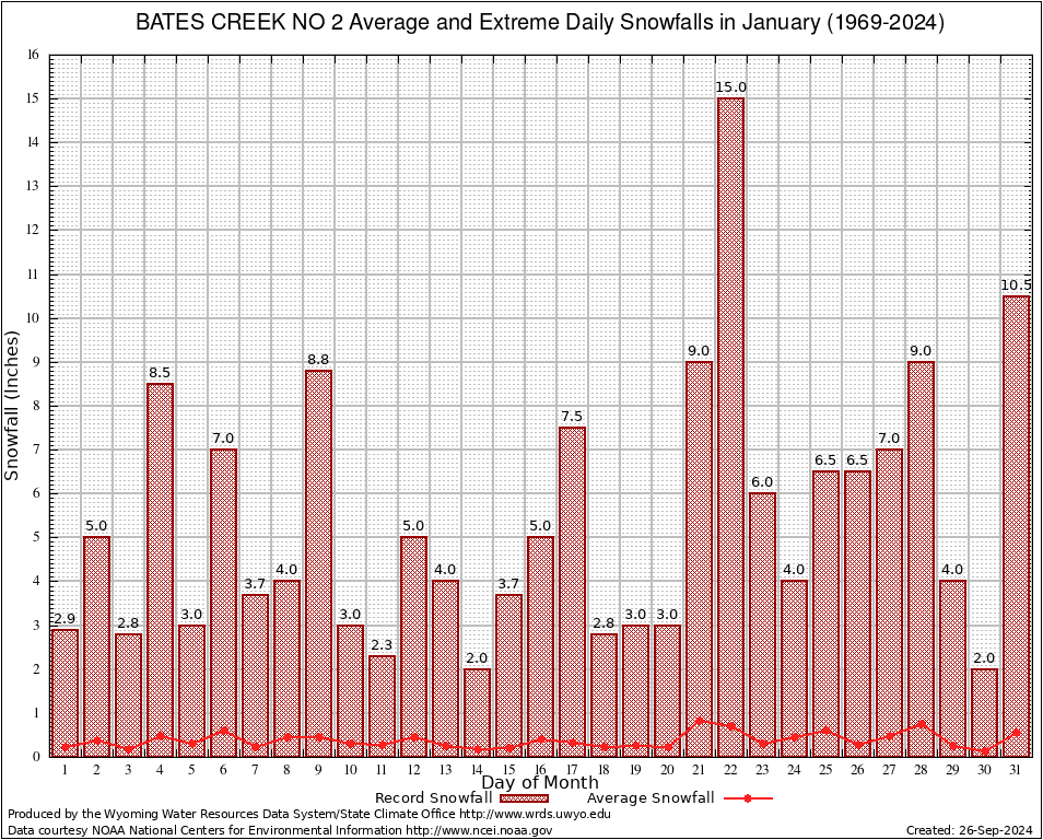 January Average and Extreme Daily Snowfall AMounts (1969-2024)