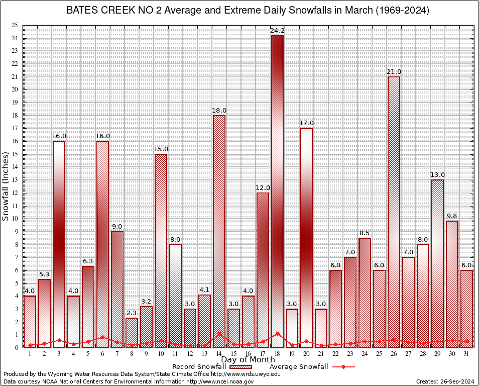 March Average and Extreme Daily Snowfall AMounts (1969-2024)