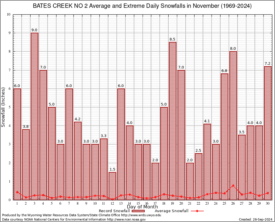 November Average and Extreme Daily Snowfall AMounts (1969-2024)