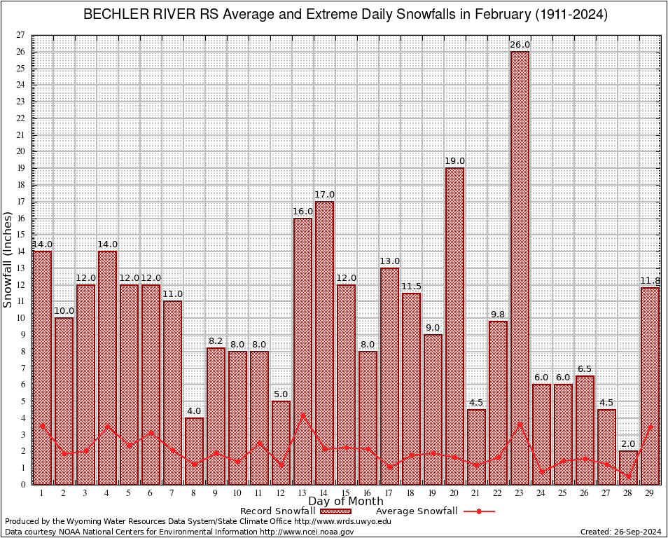 February Average and Extreme Daily Snowfall AMounts (1911-2024)