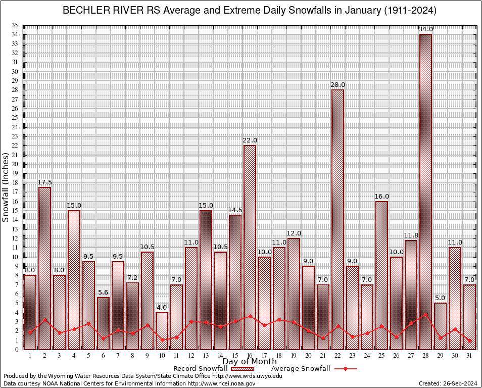 January Average and Extreme Daily Snowfall AMounts (1911-2024)