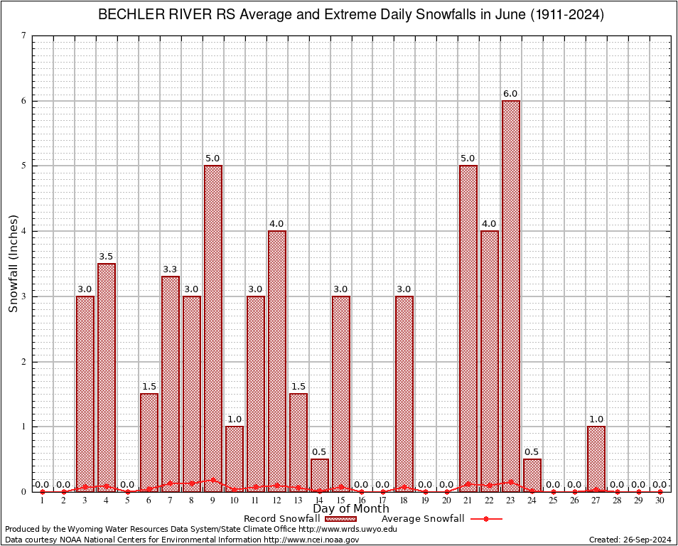 June Average and Extreme Daily Snowfall AMounts (1911-2024)