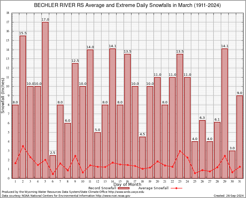 March Average and Extreme Daily Snowfall AMounts (1911-2024)