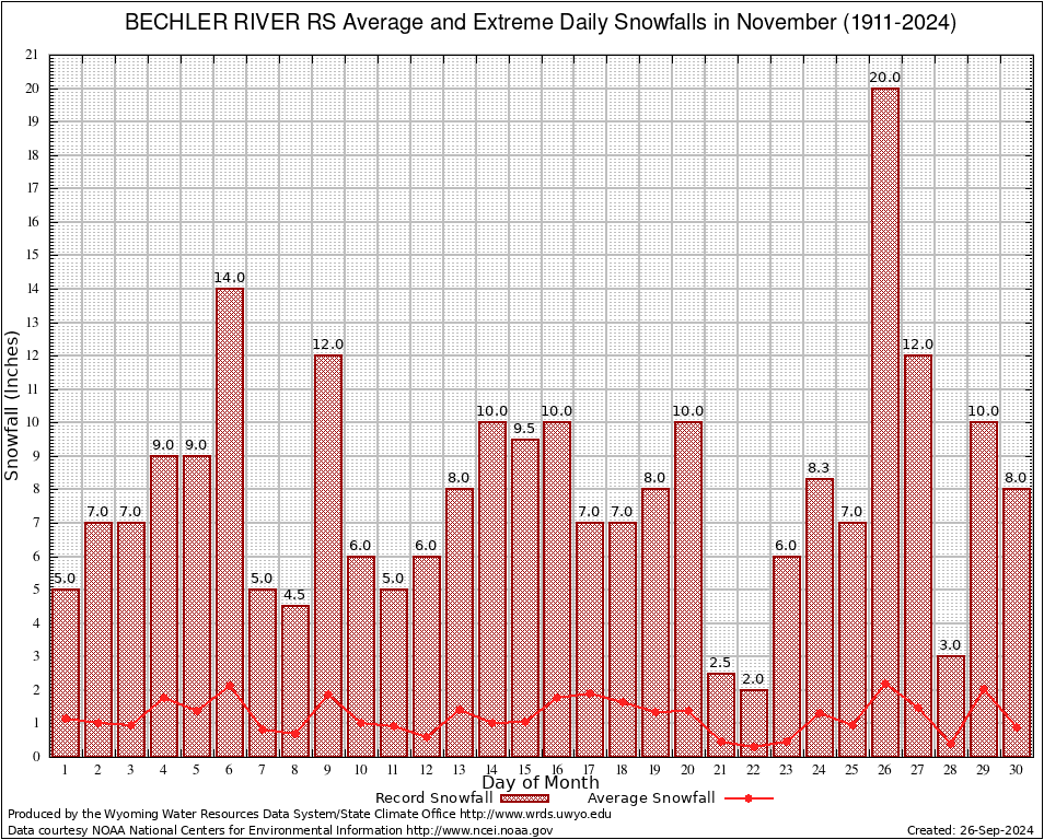 November Average and Extreme Daily Snowfall AMounts (1911-2024)