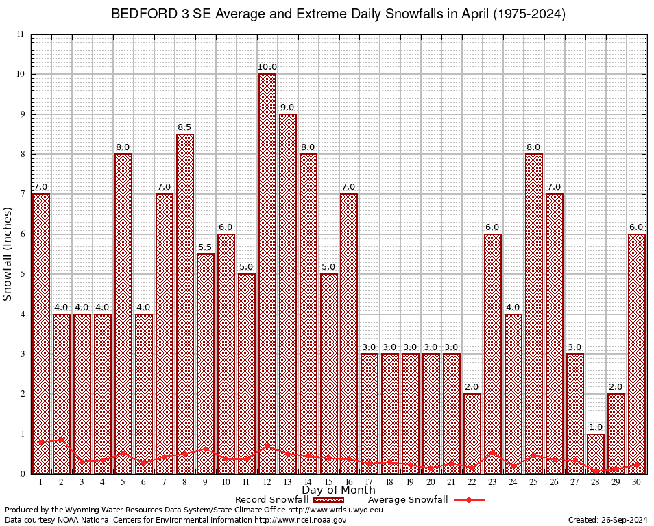 April Average and Extreme Daily Snowfall AMounts (1975-2024)