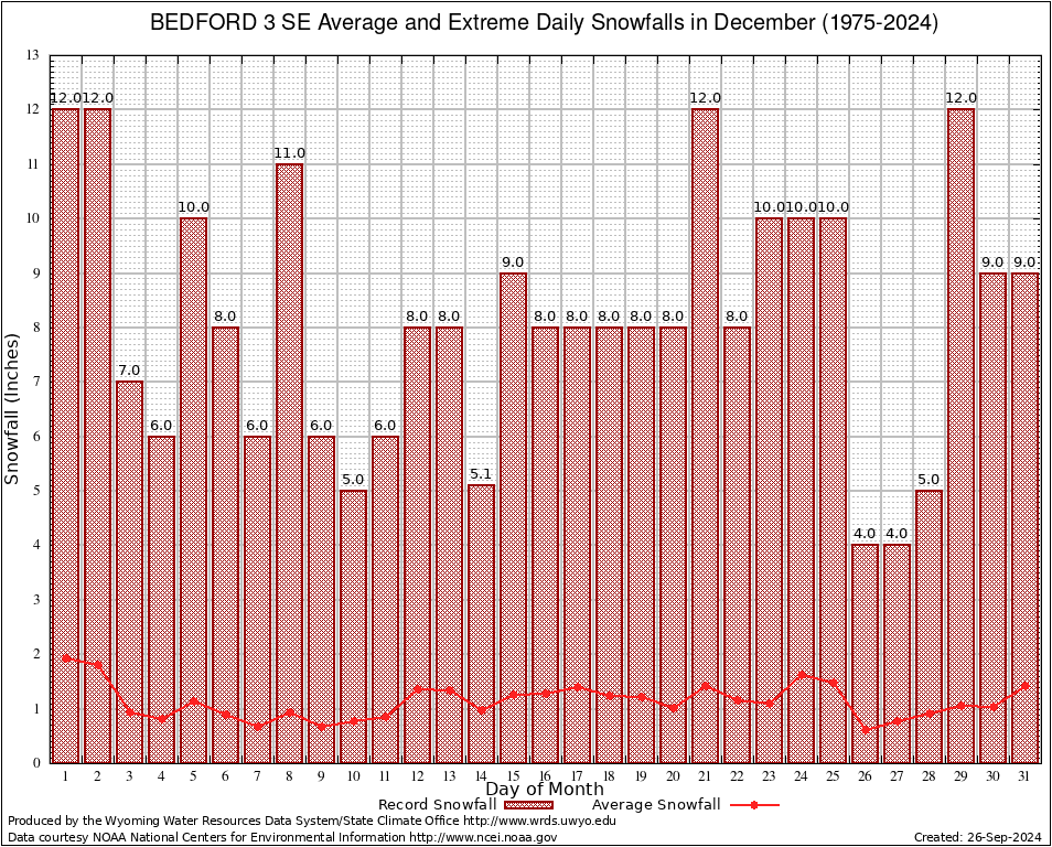 December Average and Extreme Daily Snowfall AMounts (1975-2024)