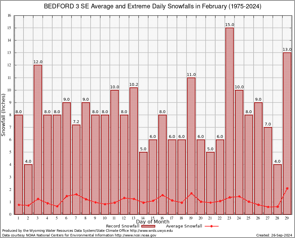 February Average and Extreme Daily Snowfall AMounts (1975-2024)