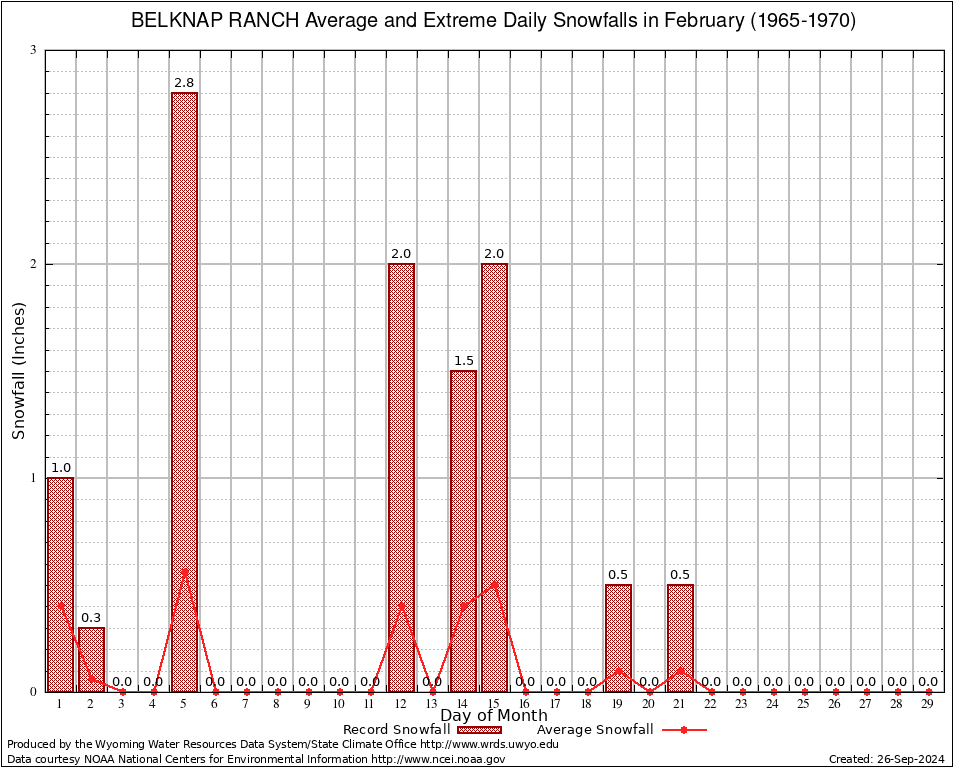 February Average and Extreme Daily Snowfall AMounts (1965-1970)