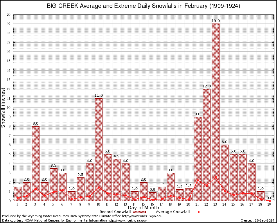 BIG CREEK (480655) February Average and Extreme Daily Snowfall AMounts (1909-1924) To index page for BIG CREEK
