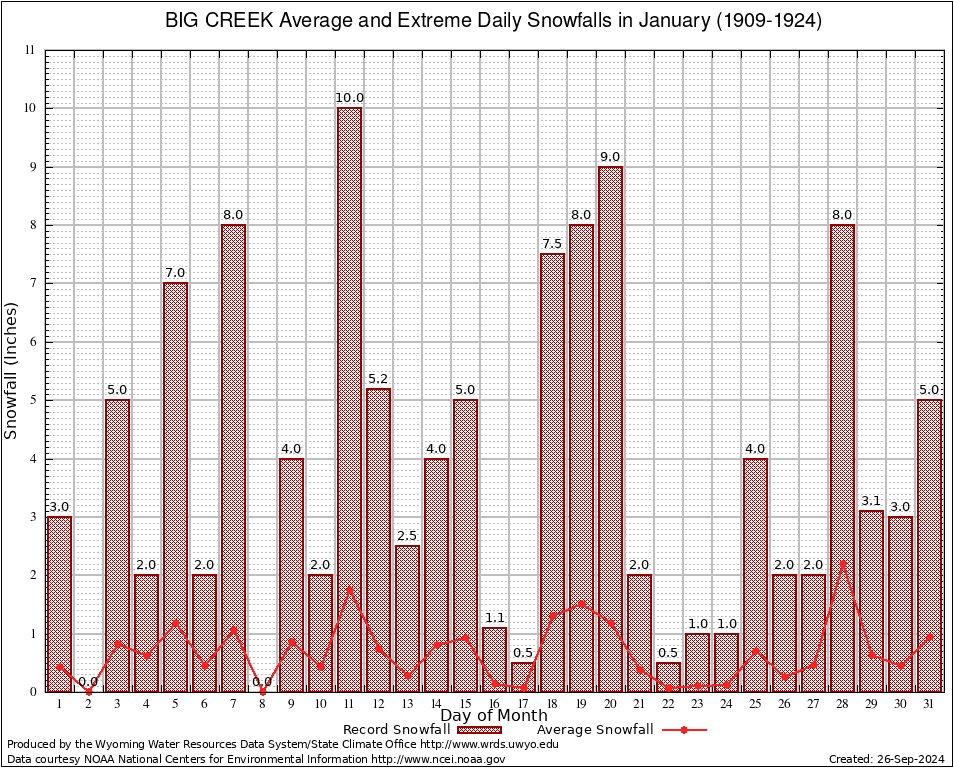 BIG CREEK (480655) January Average and Extreme Daily Snowfall AMounts (1909-1924) To index page for BIG CREEK
