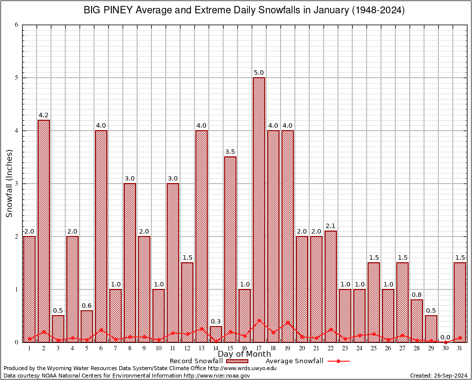 BIG PINEY (480695) January Average and Extreme Daily Snowfall AMounts (1948-2024) To index page for BIG PINEY