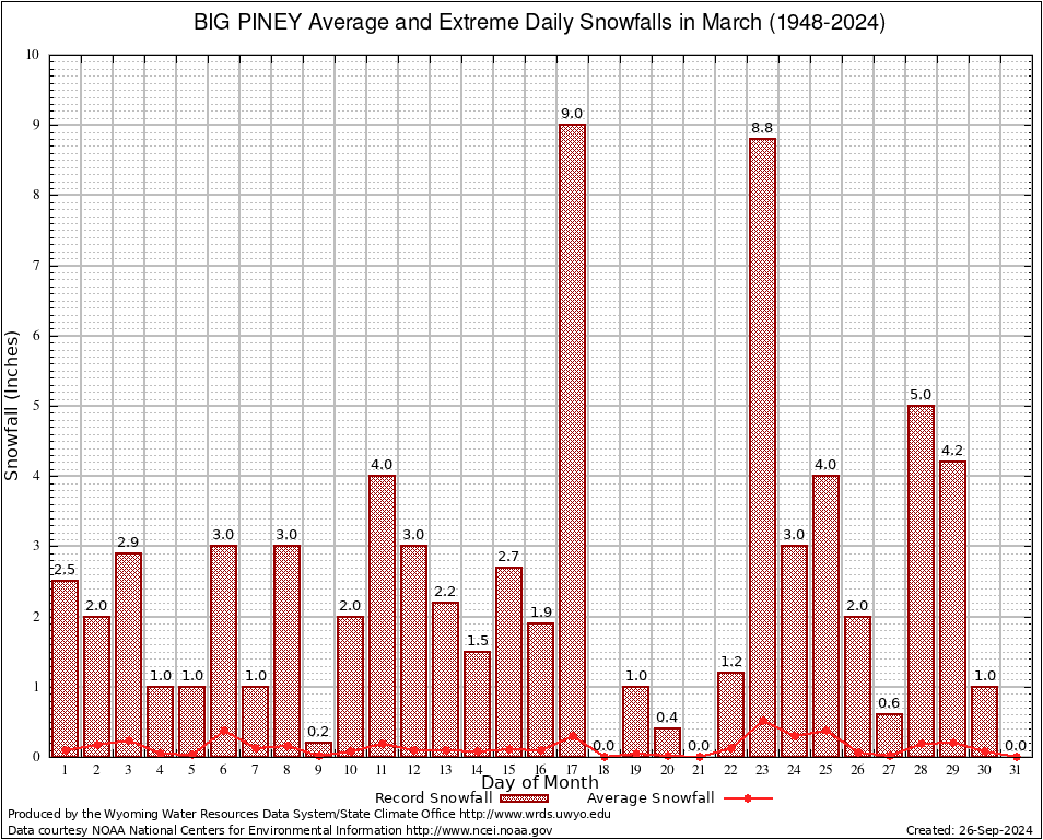 March Average and Extreme Daily Snowfall AMounts (1948-2024)