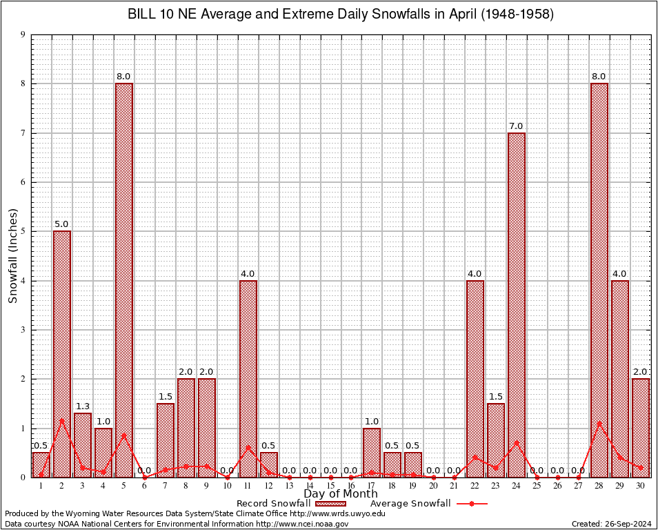 April Average and Extreme Daily Snowfall AMounts (1948-1958)