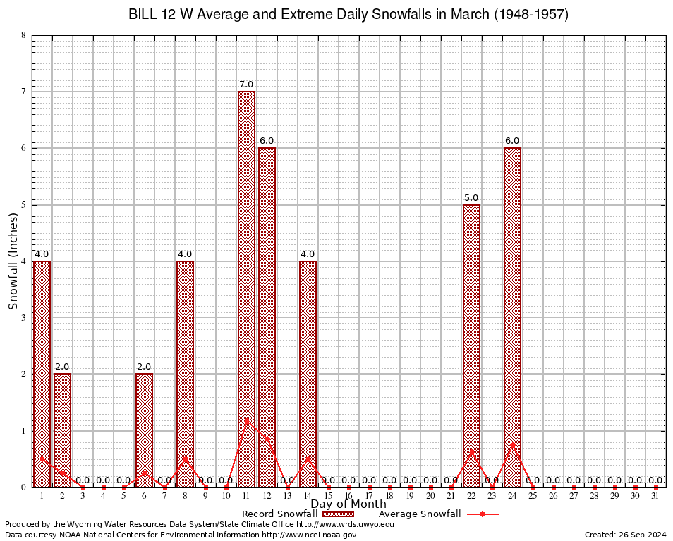March Average and Extreme Daily Snowfall AMounts (1948-1957)