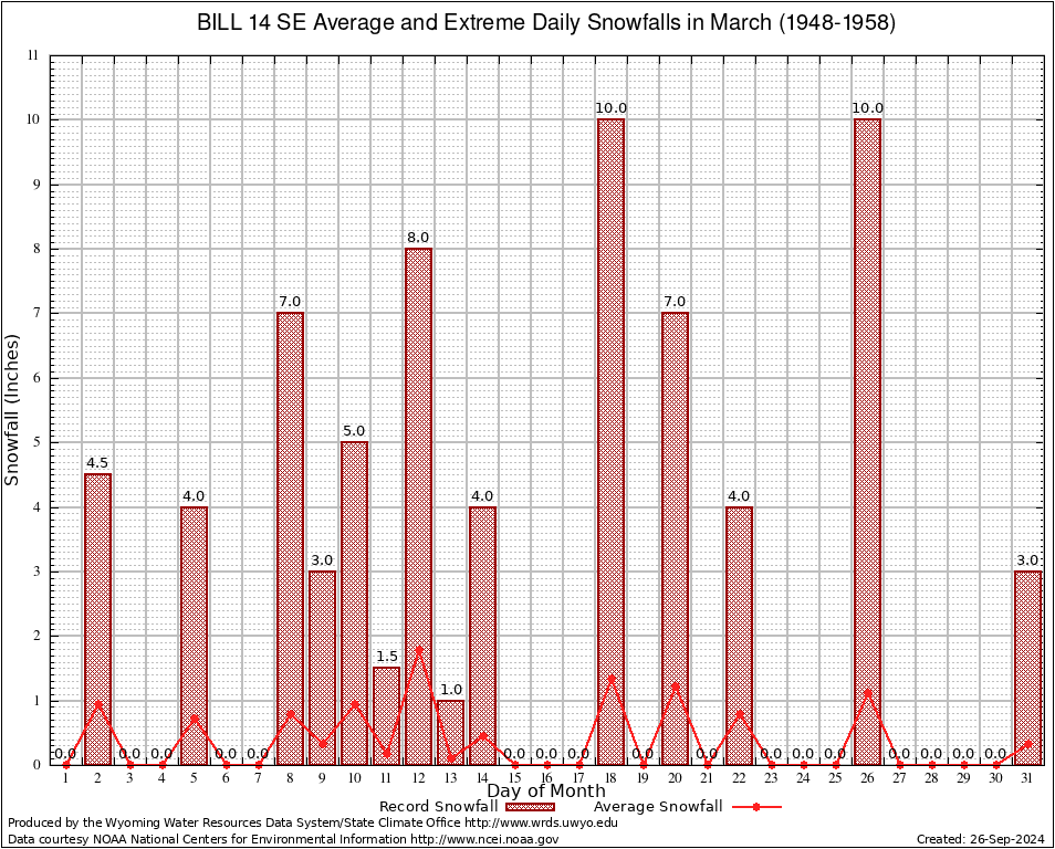 March Average and Extreme Daily Snowfall AMounts (1948-1958)