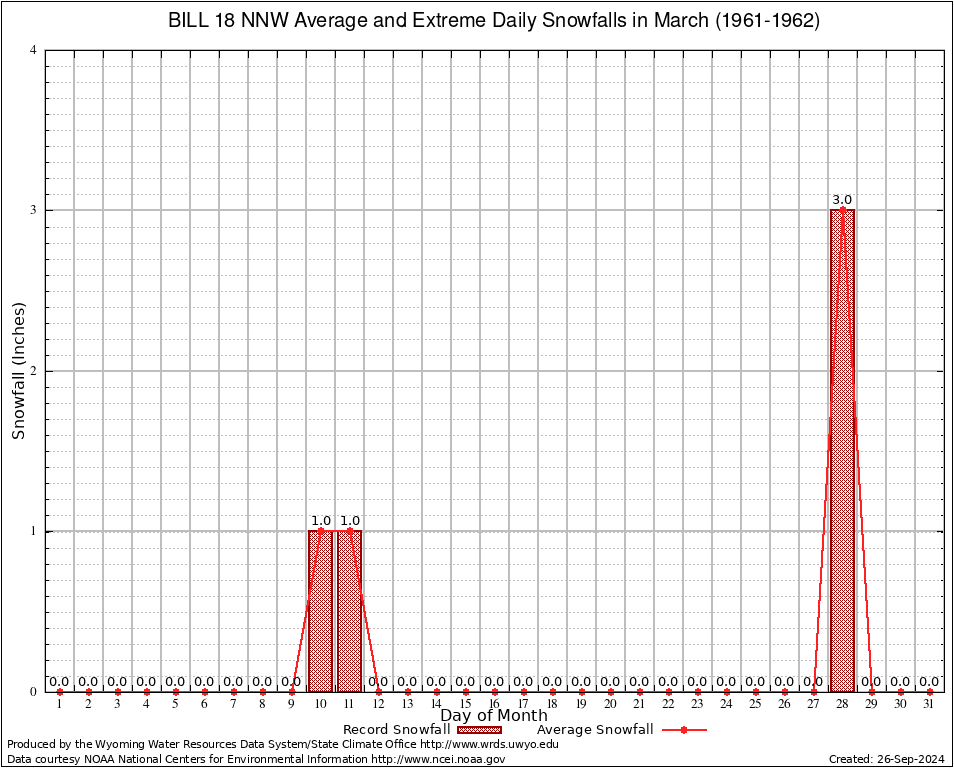 March Average and Extreme Daily Snowfall AMounts (1961-1962)