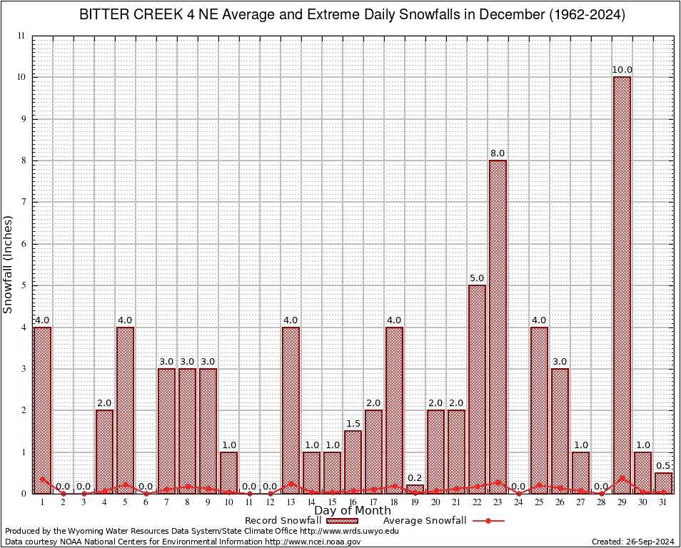 December Average and Extreme Daily Snowfall AMounts (1962-2024)