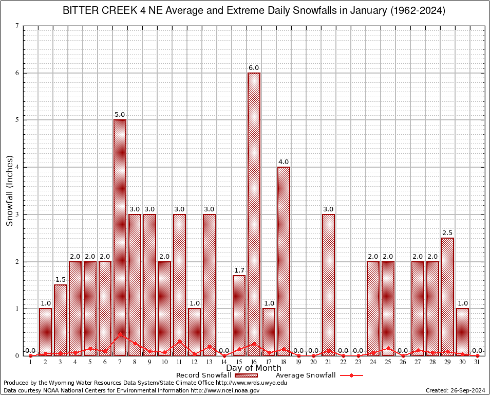 January Average and Extreme Daily Snowfall AMounts (1962-2024)
