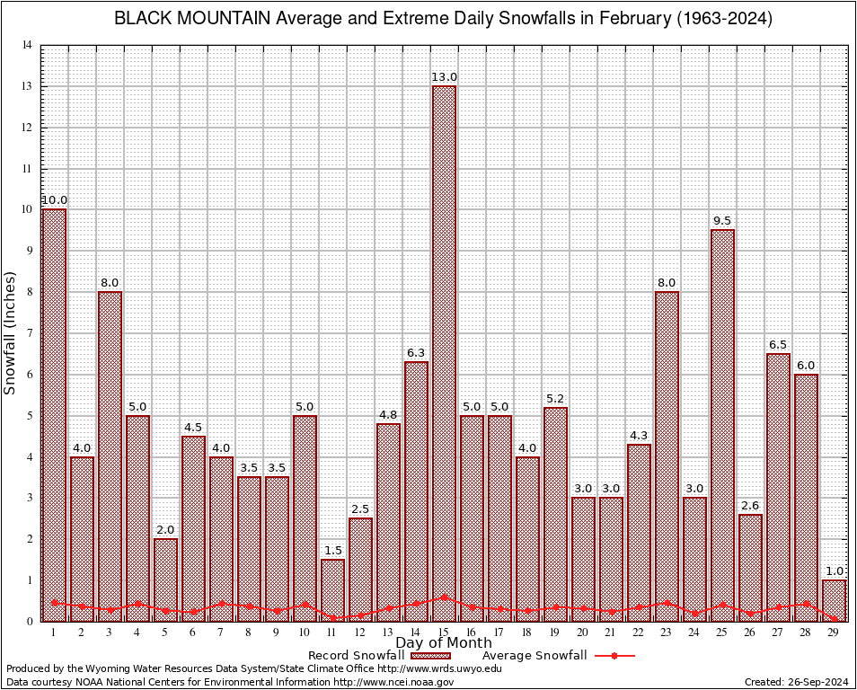 February Average and Extreme Daily Snowfall AMounts (1963-2024)