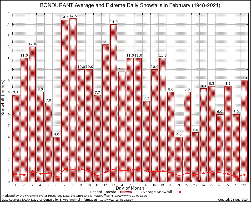 BONDURANT (480865) February Average and Extreme Daily Snowfall AMounts (1948-2024) To index page for BONDURANT