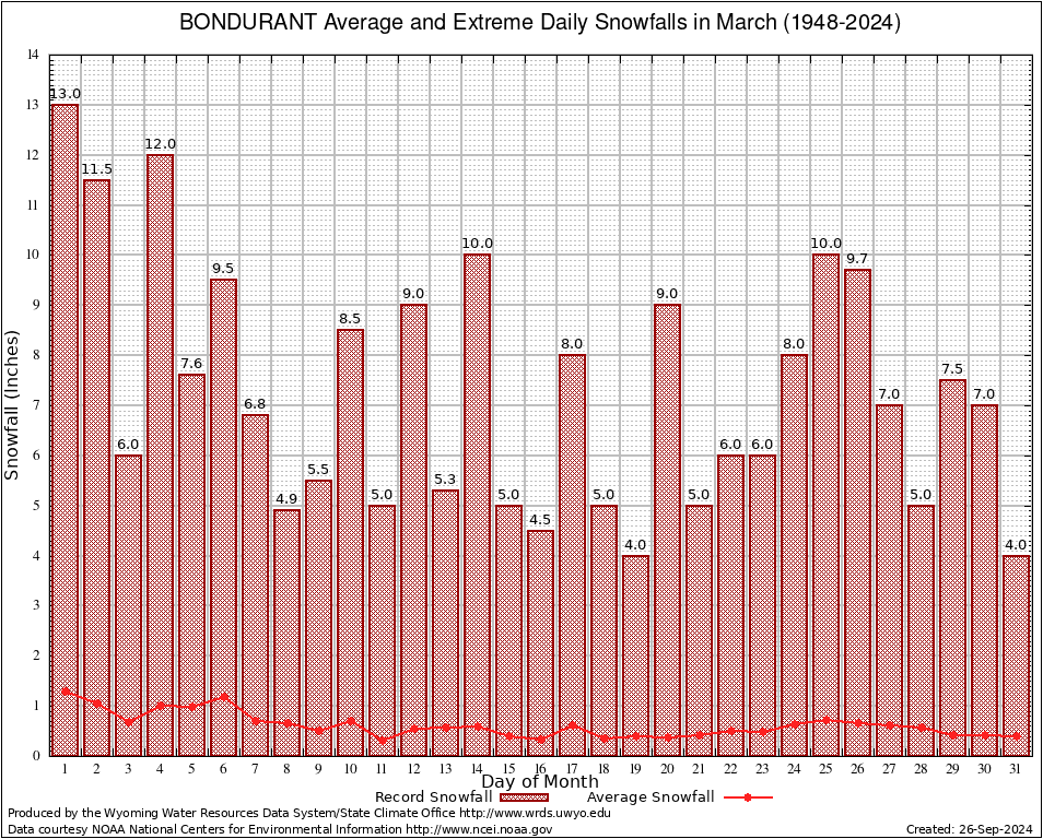 March Average and Extreme Daily Snowfall AMounts (1948-2024)