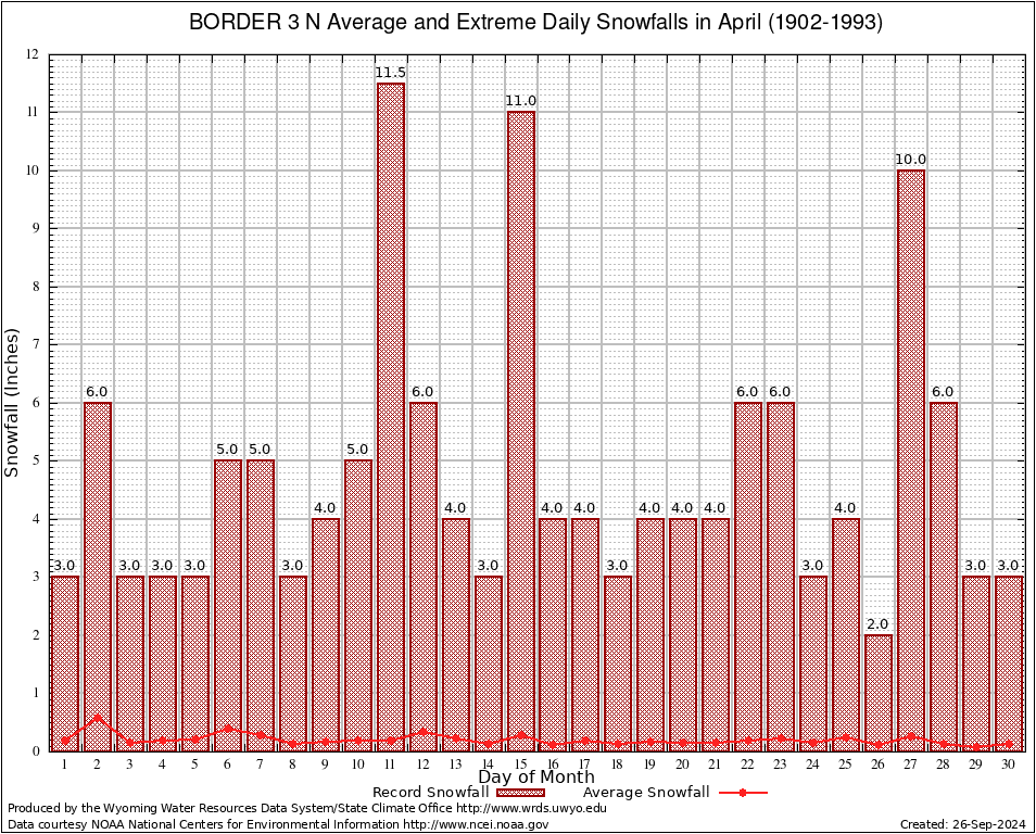 April Average and Extreme Daily Snowfall AMounts (1902-1993)