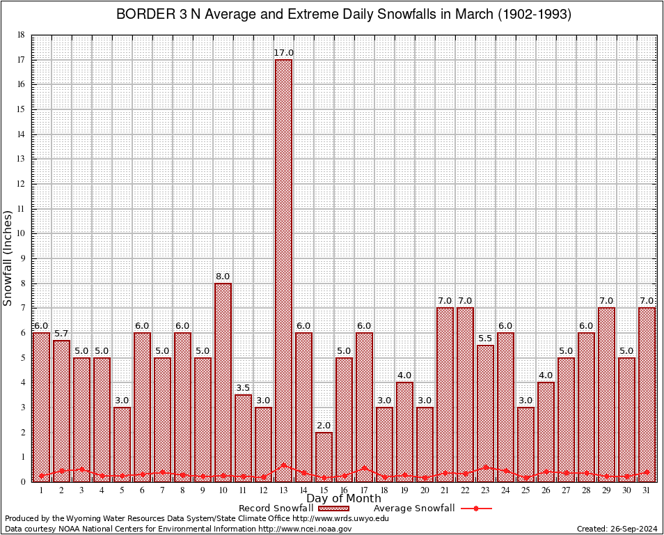 March Average and Extreme Daily Snowfall AMounts (1902-1993)