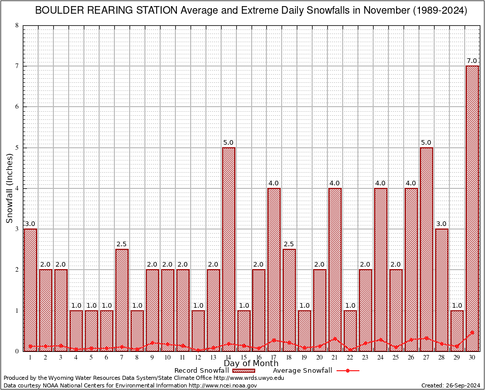 November Average and Extreme Daily Snowfall AMounts (1989-2024)