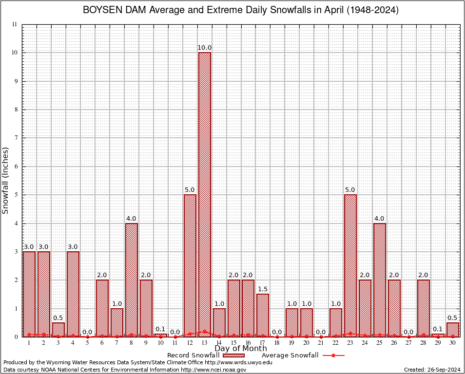 April Average and Extreme Daily Snowfall AMounts (1948-2024)