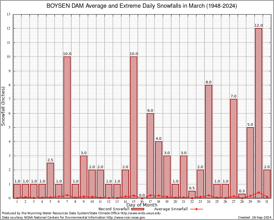 March Average and Extreme Daily Snowfall AMounts (1948-2024)