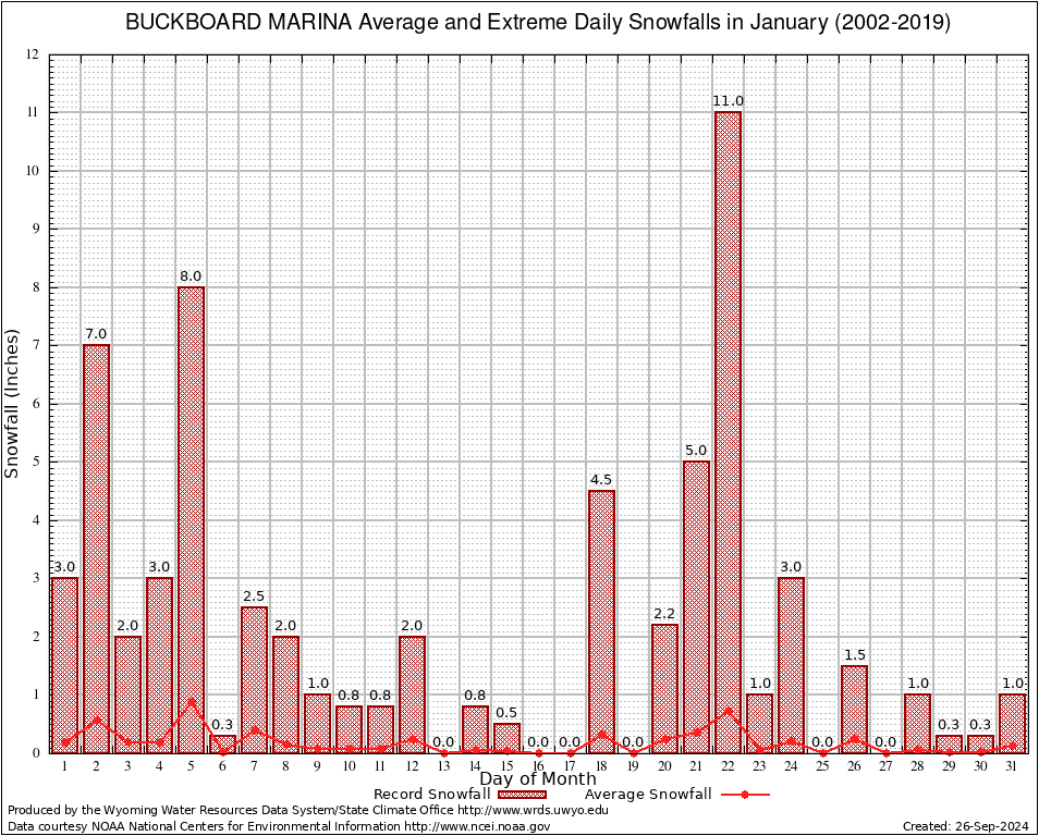 January Average and Extreme Daily Snowfall AMounts (2002-2019)