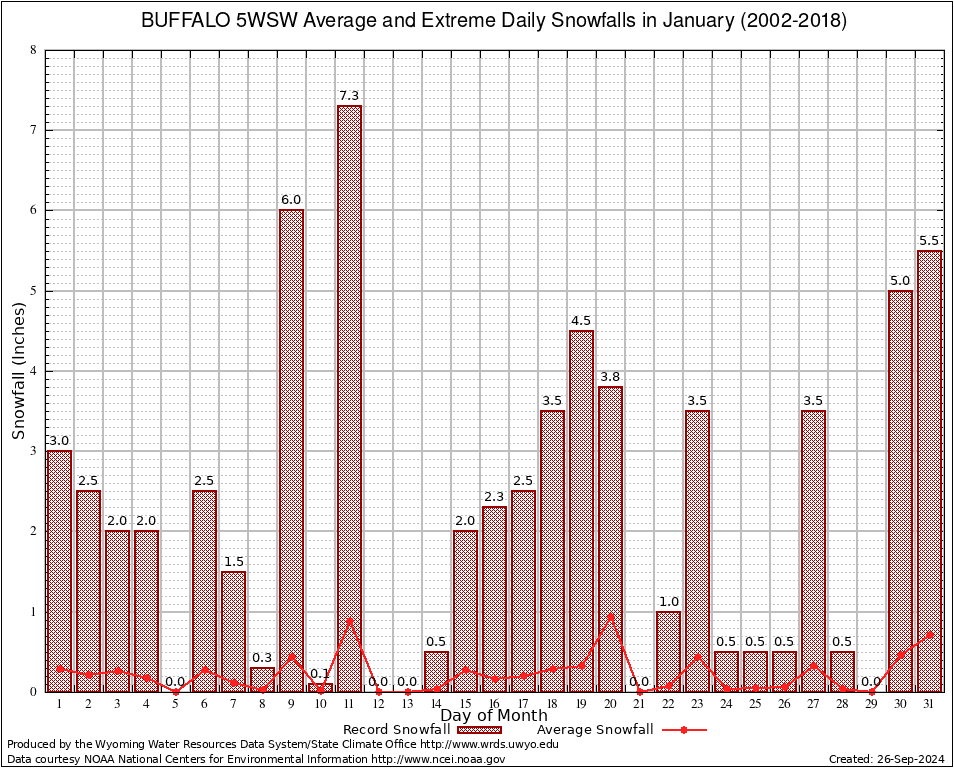 January Average and Extreme Daily Snowfall AMounts (2002-2018)