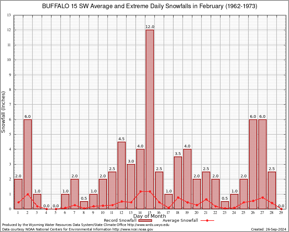 February Average and Extreme Daily Snowfall AMounts (1962-1973)