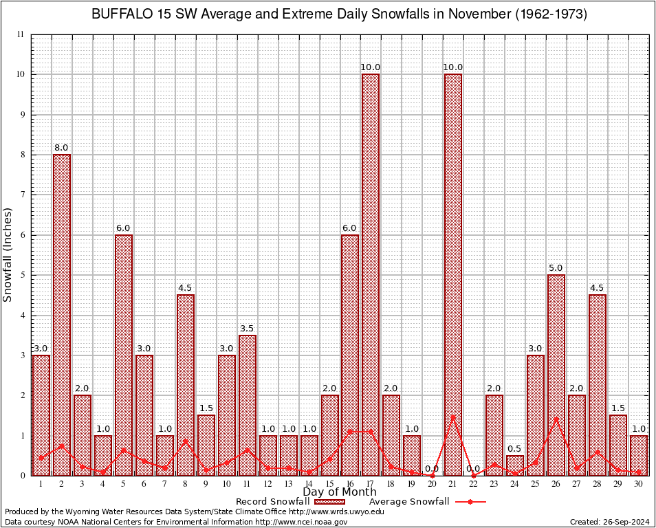 November Average and Extreme Daily Snowfall AMounts (1962-1973)